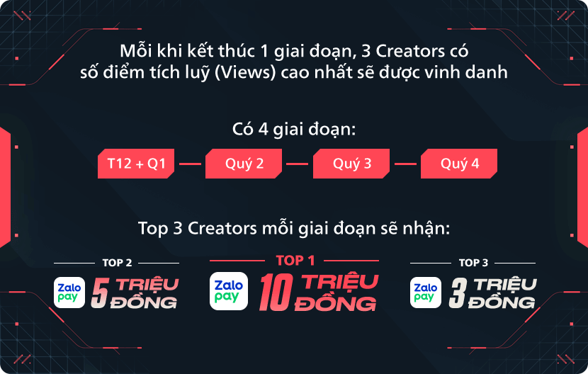 Phần thưởng Zalopay cho Top 3 Creator tại 4 giai đoạn.