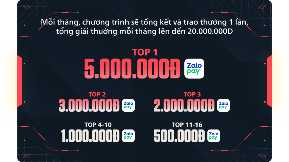 Phần thưởng Zalopay hằng tháng, tổng giá trị lên tới 20.000.000đ.
